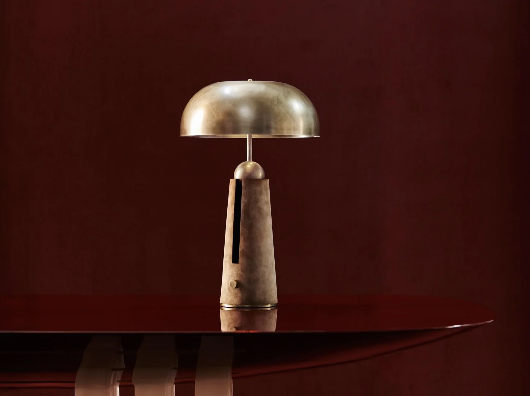 The metronome series evokes the measure and balance of its namesake. A patinated brass sphere perches atop the conical base, which is hand-wrapped in suede to provide a lush tactile contrast. A channel in the firmly grounded base reveals an intimate connection between the two forms. A dimmer knob is set into the base.