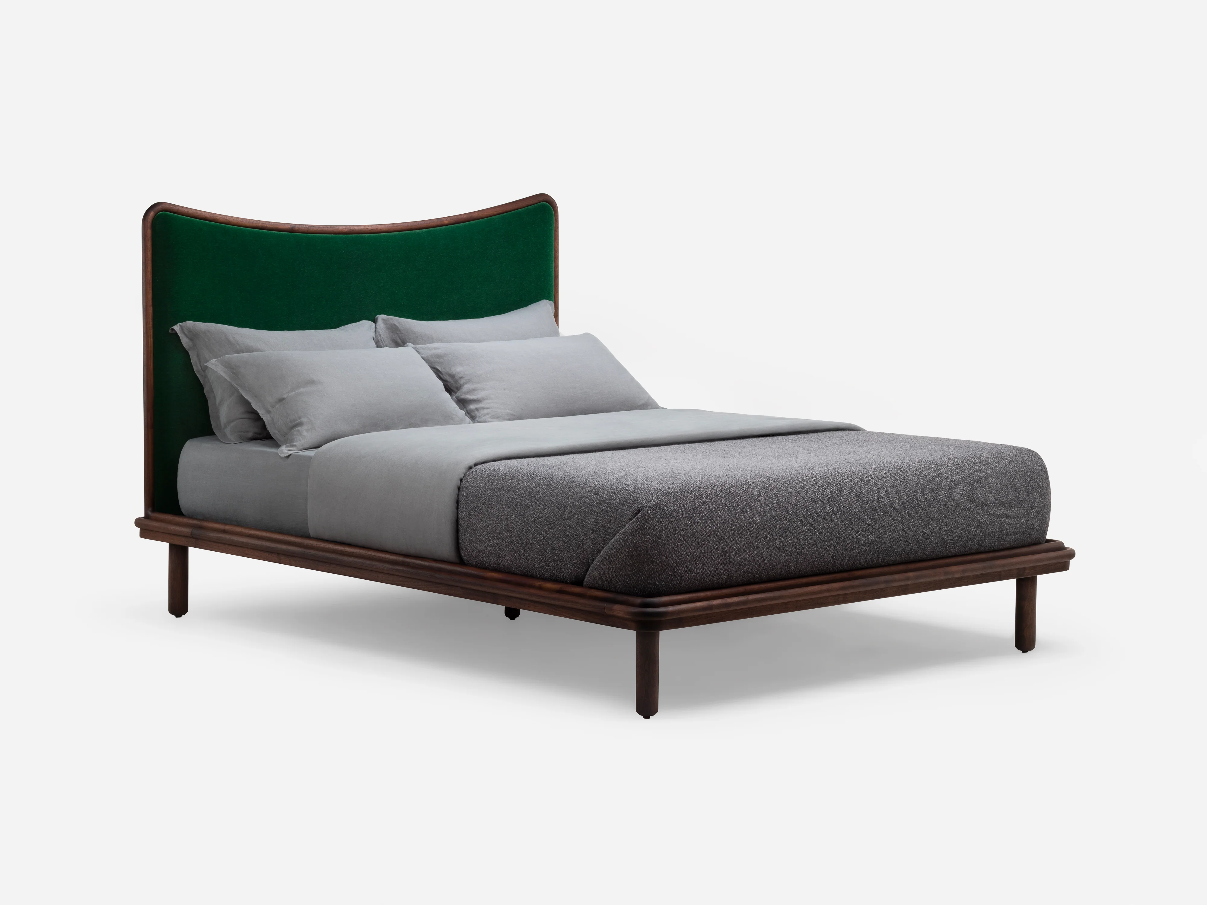 Inspired by the juxtaposition of old and new design seen in converted Brooklyn brownstones, Carlton Bed is modern with historical references. It shares its design language with Elliot Table and Chair. The frame is made from a series of carved wood components, revealing a stunning composition of grain patterns. Upholstery softens the headboard.