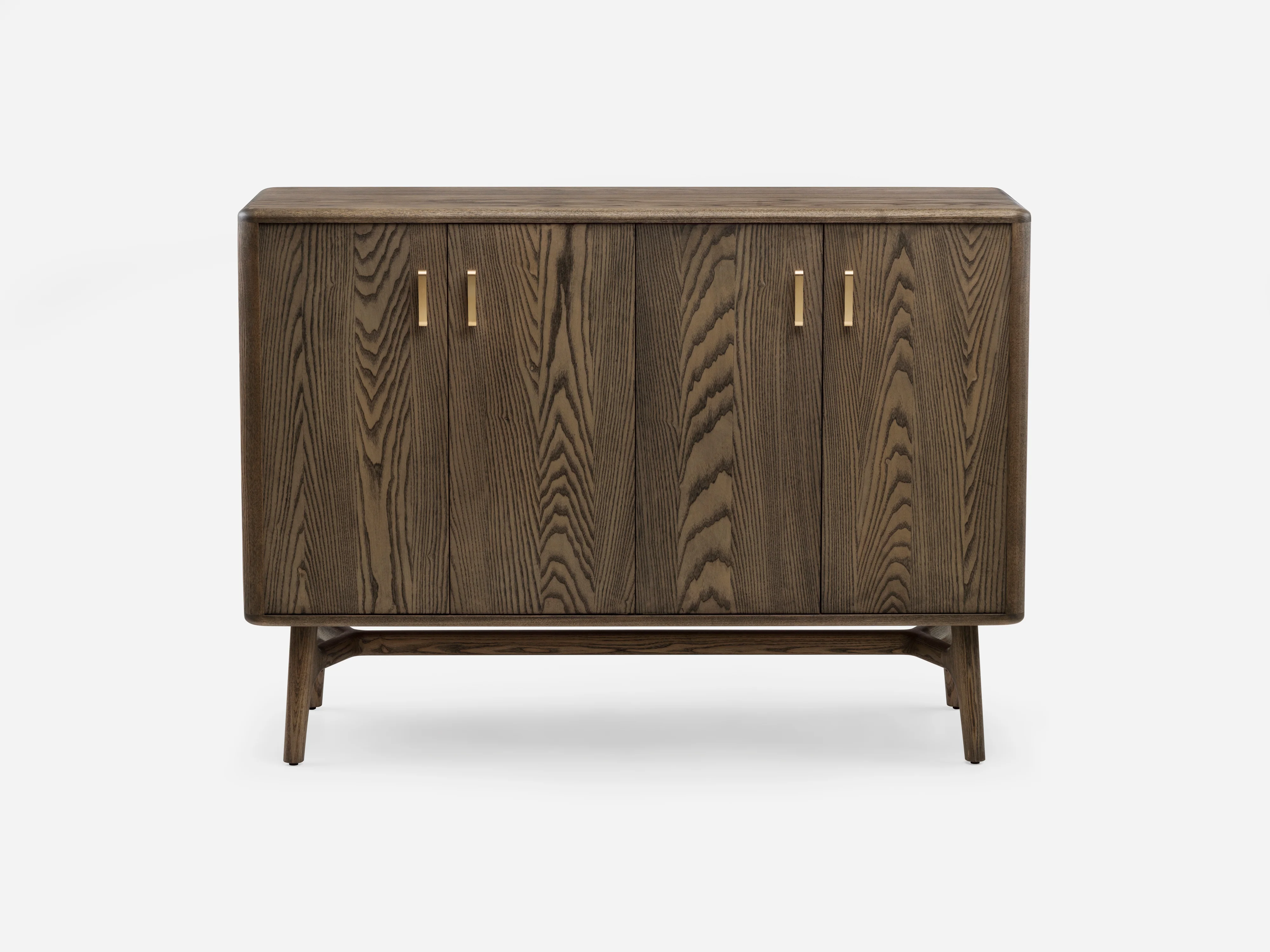 The solid wood cabinets feature machined brass handles and an elegant leg frame. Organization is optimized with cable management, adjustable internal shelving, and optional internal storage trays, available separately, that connect to the shelves with hidden magnets.