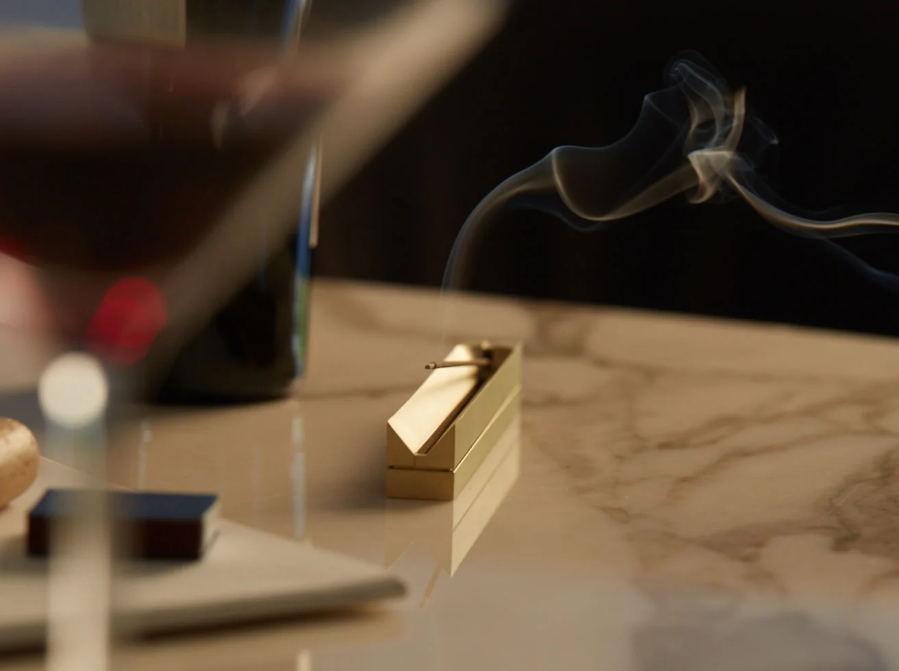 The Narrow Box Burner has two stacking layers- the base is an ash catch and the burner is an open top holder for short or long stick incense. This burner has a patented holder that releases the nub of incense over burning. Its satin brass finish will take on a darker patina over time.