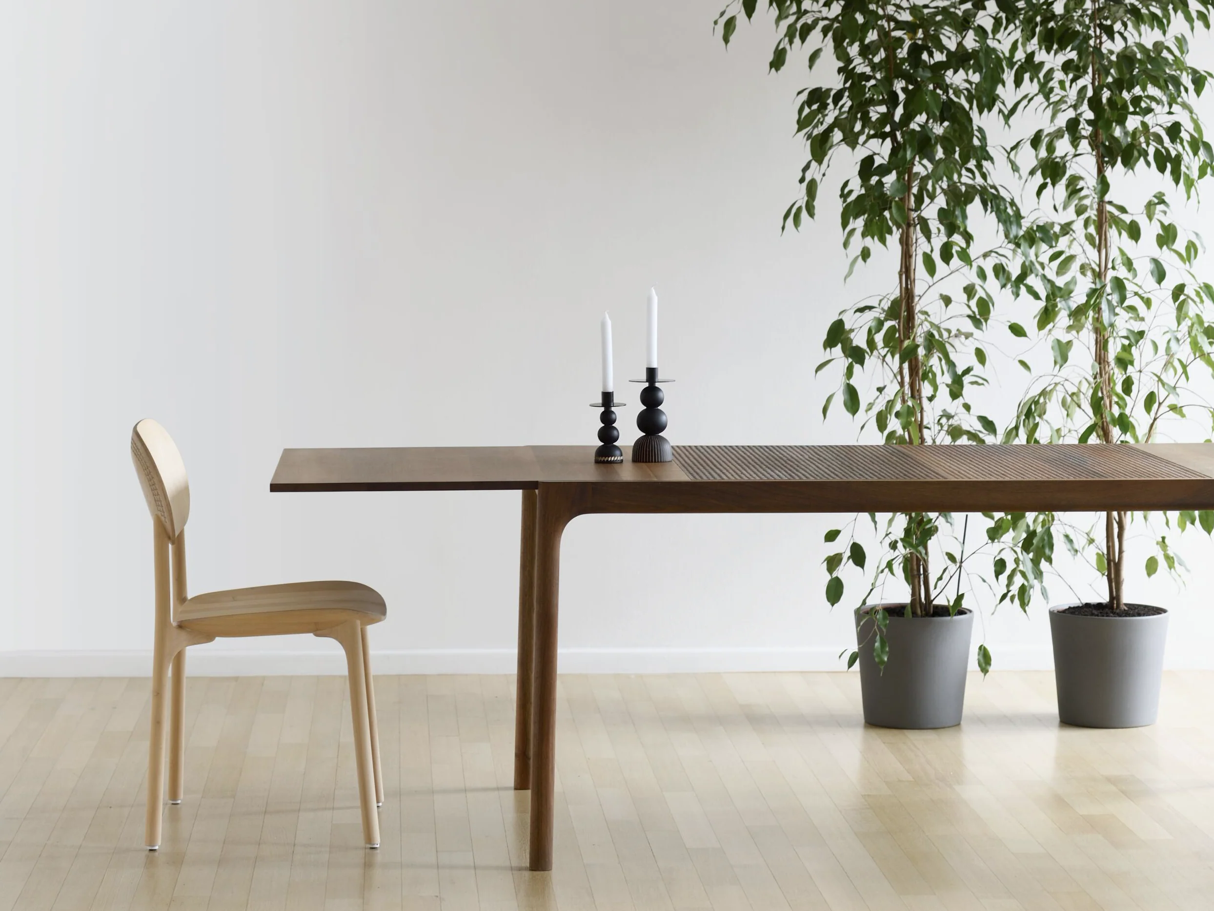 Unna Table is an elegant multipurpose table that is super lightweight even though it is made entirely in solid wood. What distinguishes the extendable version of the table in addition to its overall sleek design are lace-like hand-carved table top extension leaves, which are inserted in the middle of the table. The table can be extended by 20” with one leaf and 40” with two extension leaves, both conveniently stored underneath the table top.